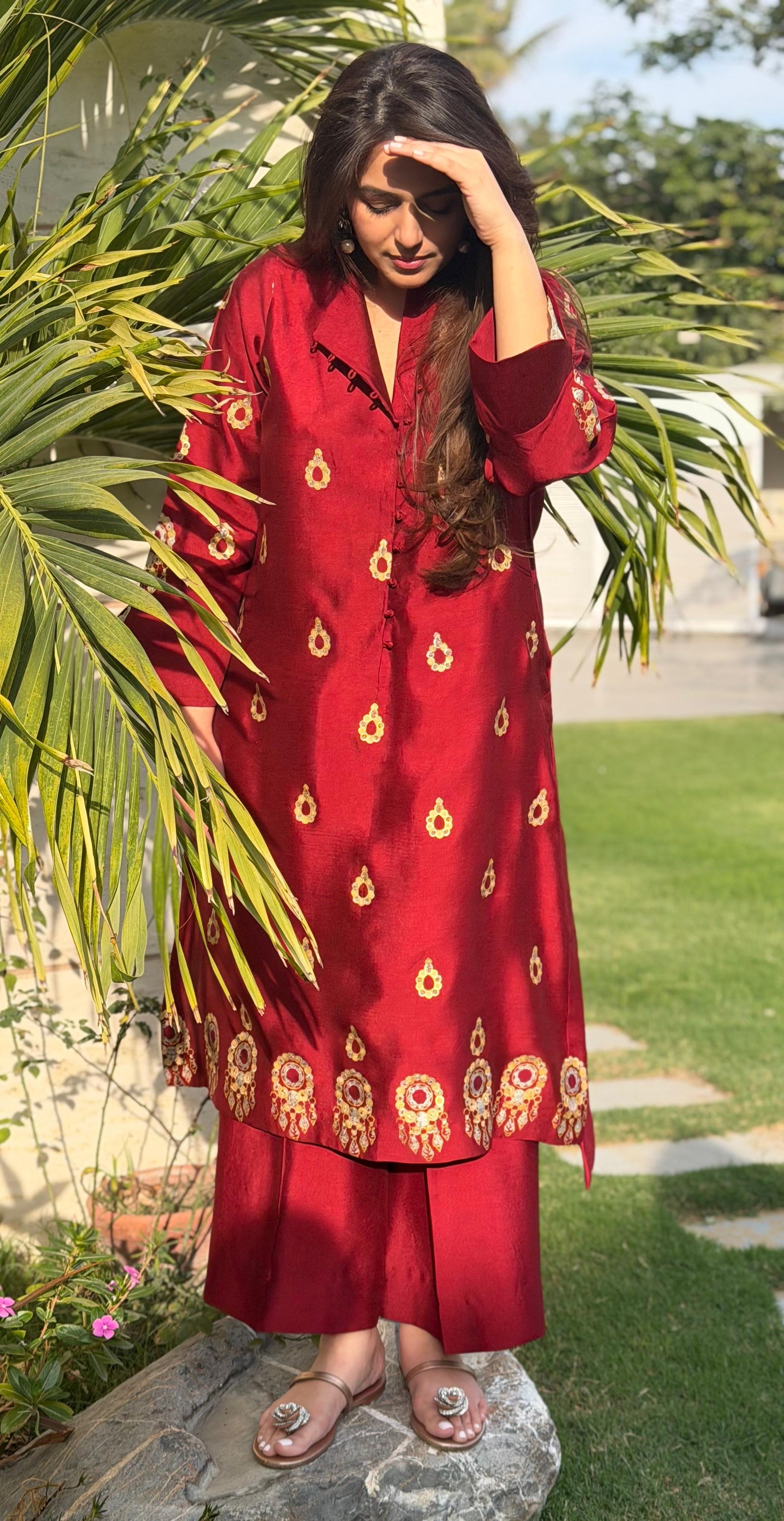 - A deep maroon hue forms the base, adorned with delicately placed embroidered motifs that lend a refined, artisanal character.