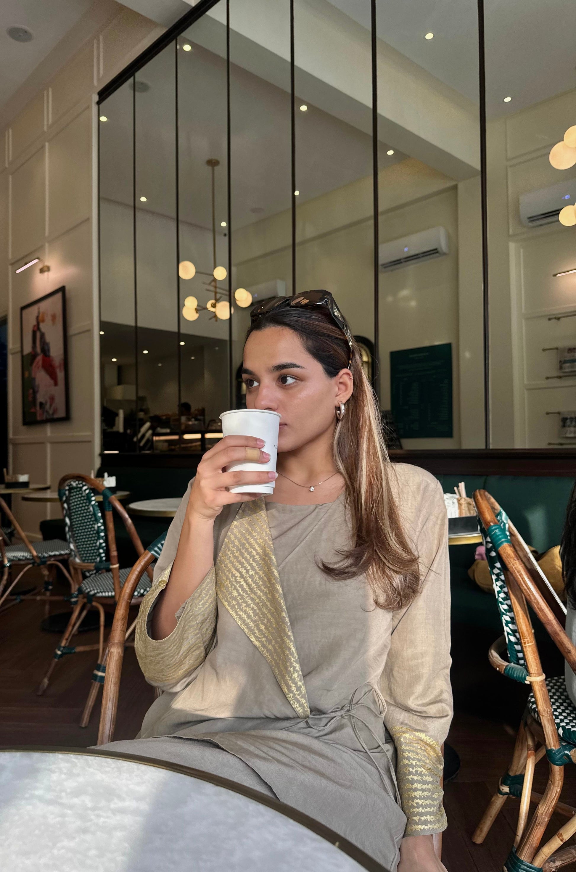- Contemporary wrap silhouette in a muted khaki tone with clean, minimal gold accents