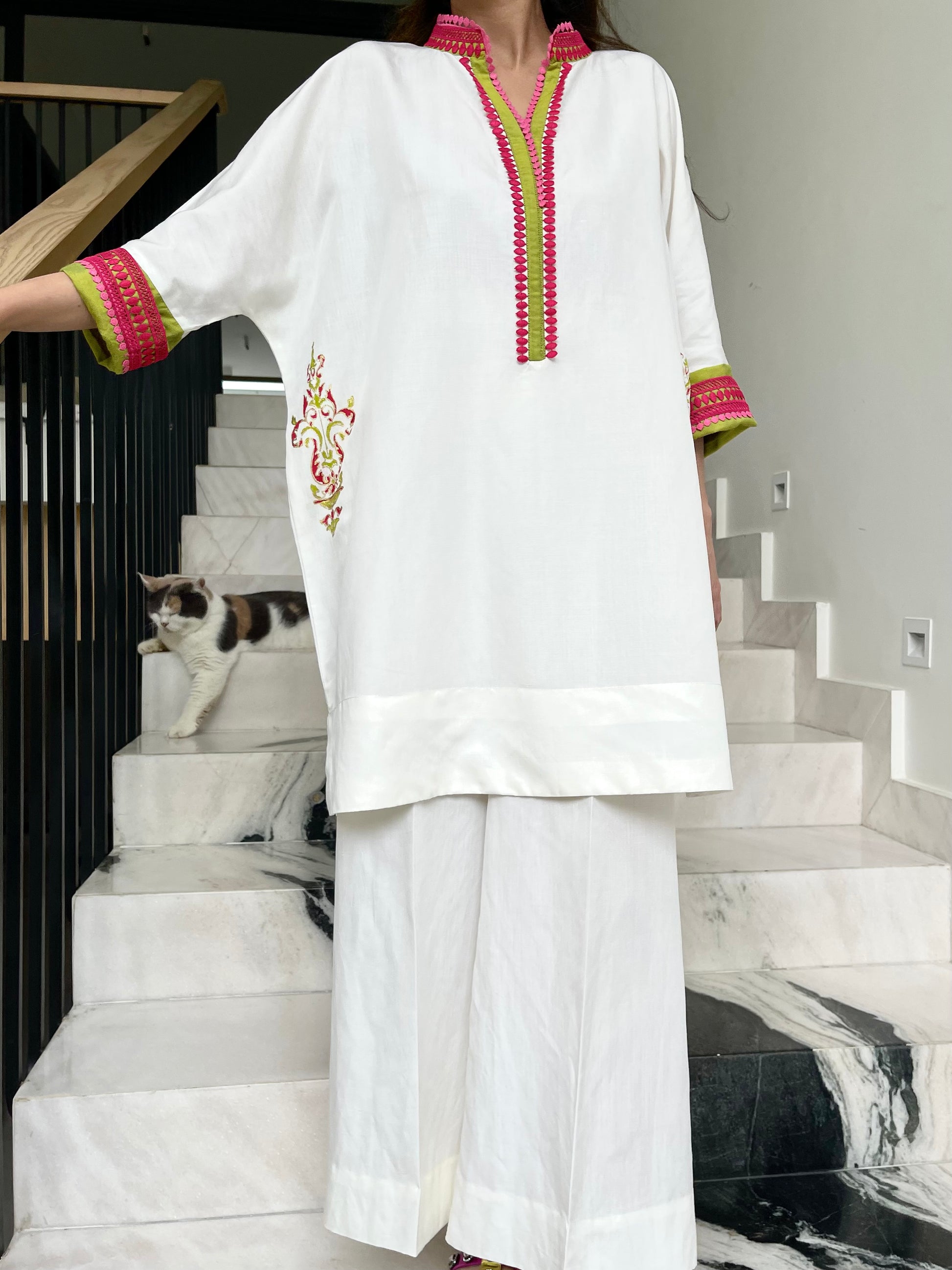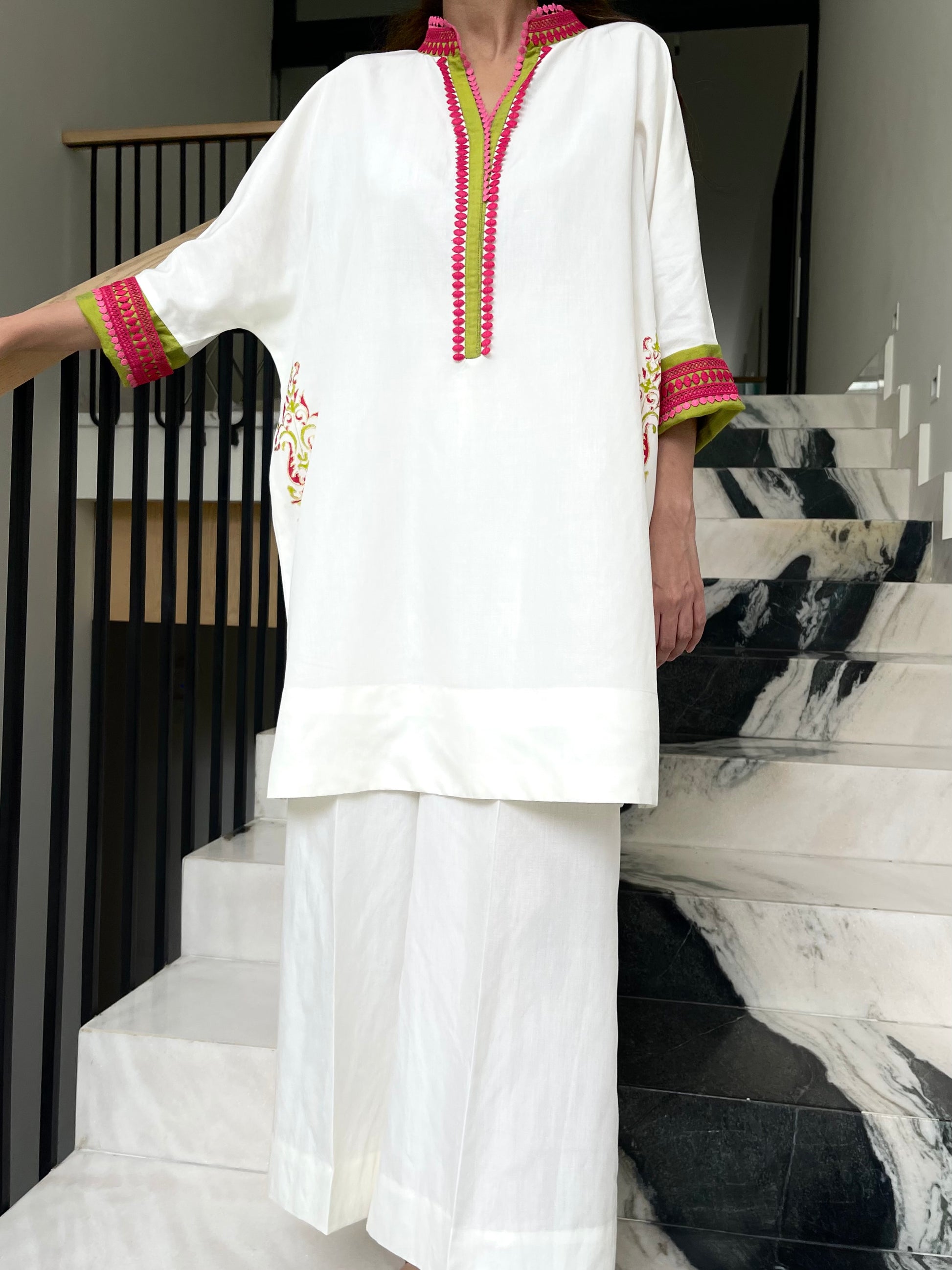 - Features contrasting color detailing on the neckline and sleeve & detailing on the side