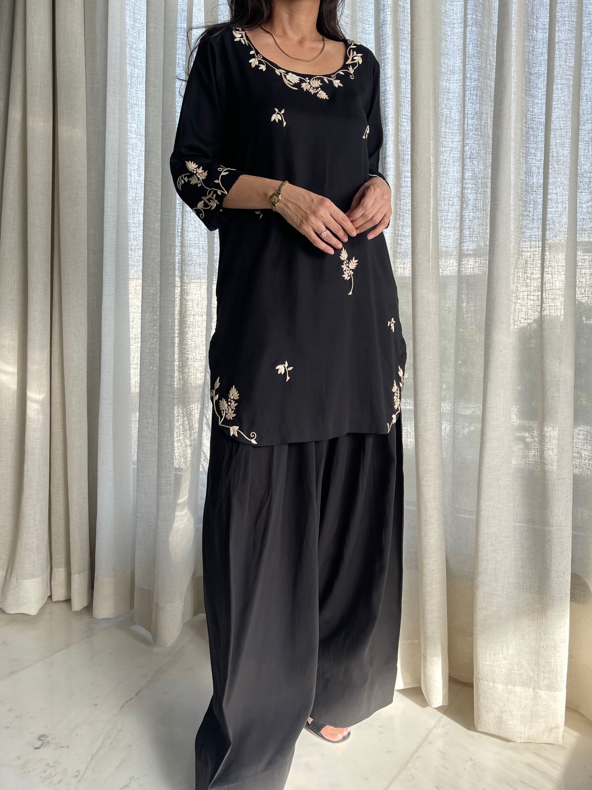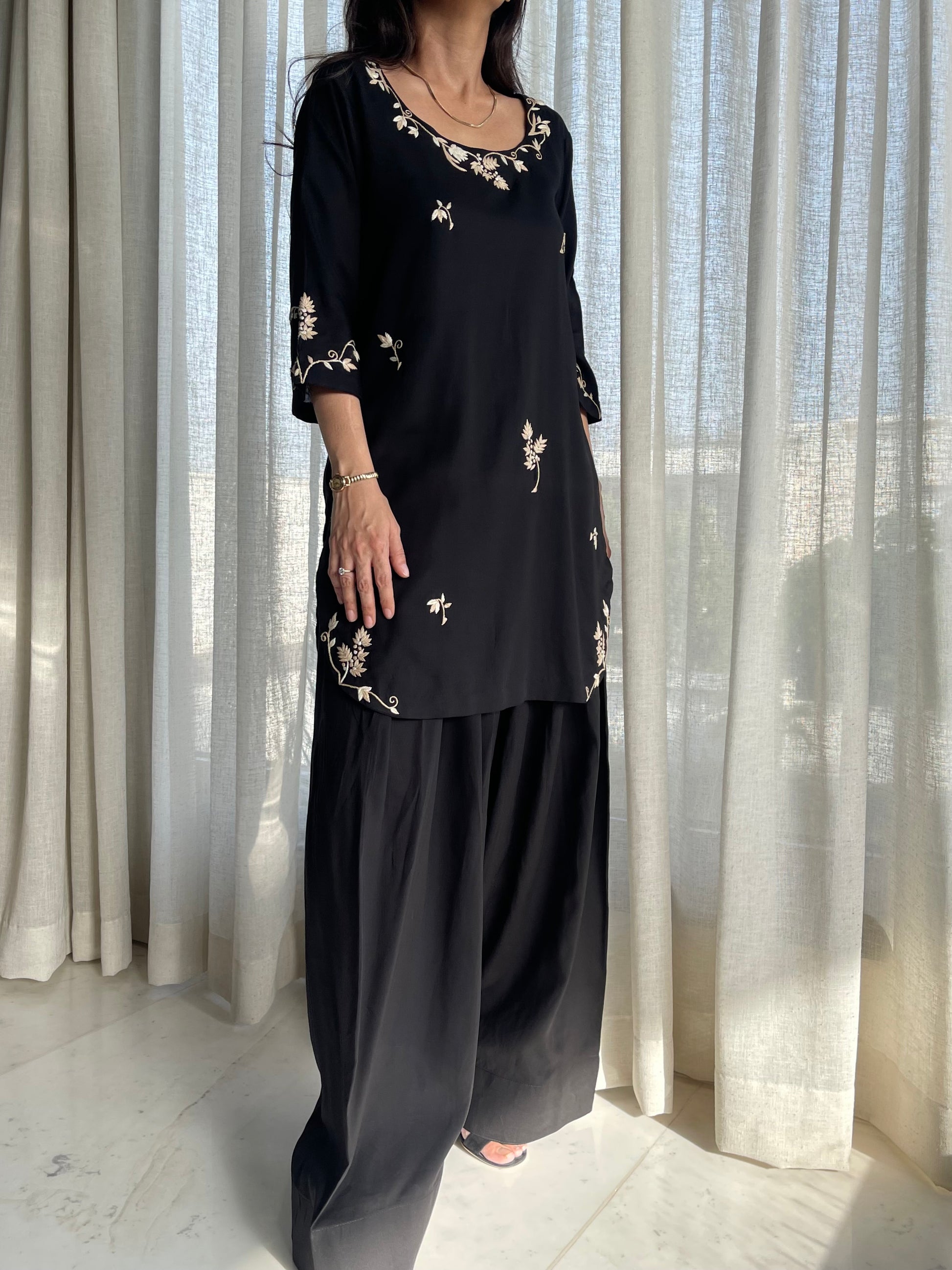 - A luxurious three-piece suit crafted from pure black silk. ( Duppatta Included!)
