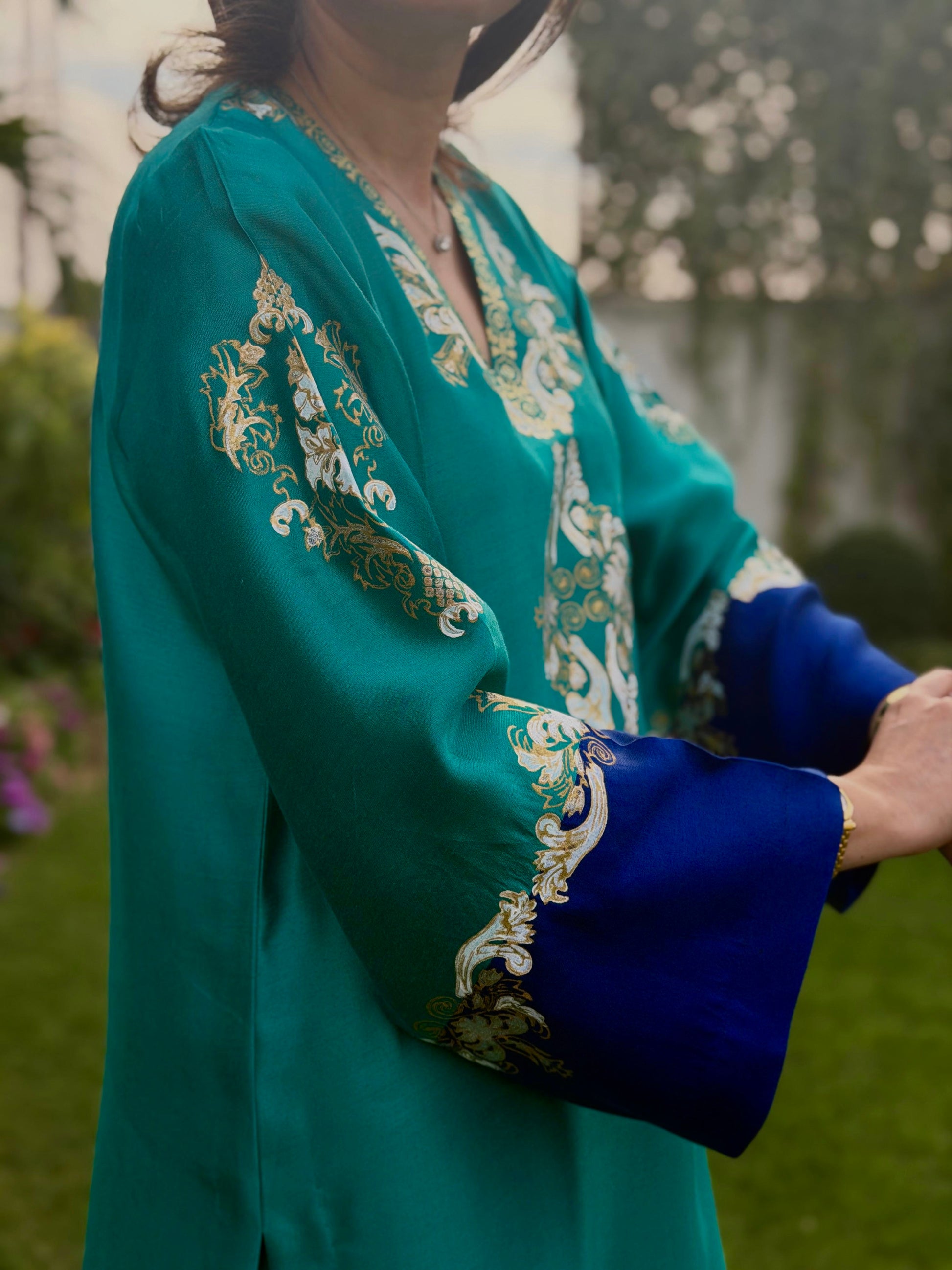 • Intricately placed embroidery along the neckline, sleeves, and hem adds an ornate yet balanced finish without overwhelming the design.