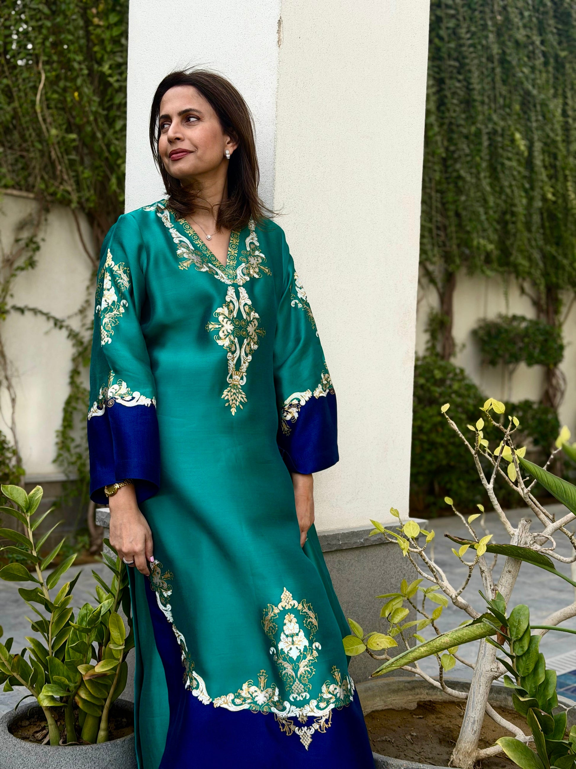 • Designed as a statement piece for festive evenings or formal gatherings, this ensemble blends regal colour play with timeless craftsmanship.